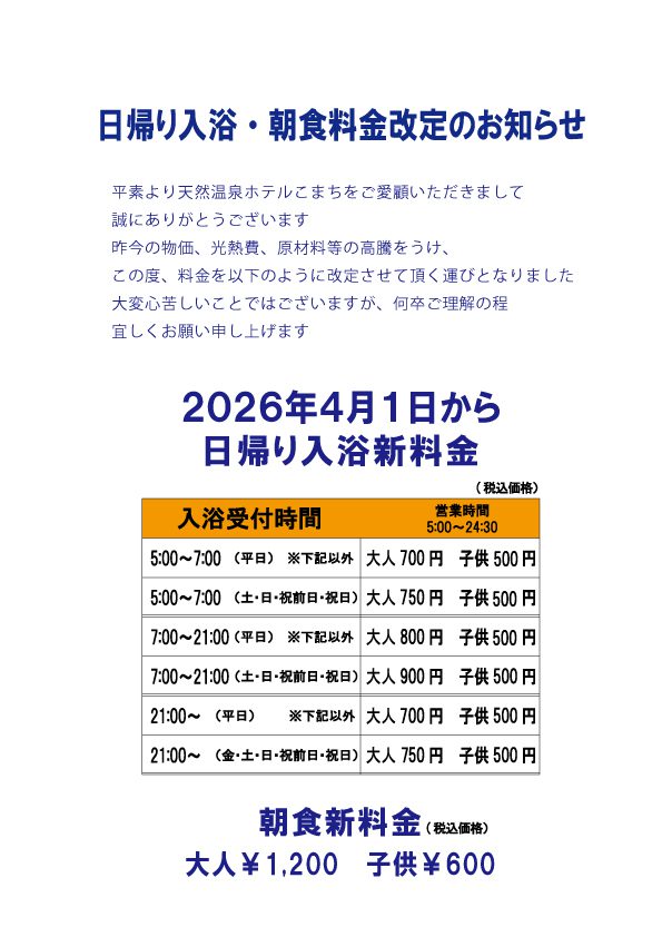 日帰り入浴・朝食料金改定のお知らせ